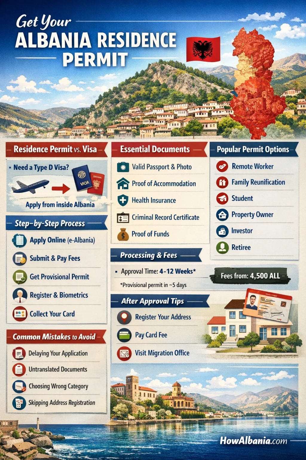 A visa is your permission to enter; some nationalities must obtain a Type D (long‑stay) visa before arriving, then apply for a residence permit after entry. Others can enter visa‑free and apply from inside Albania while lawfully in the country.